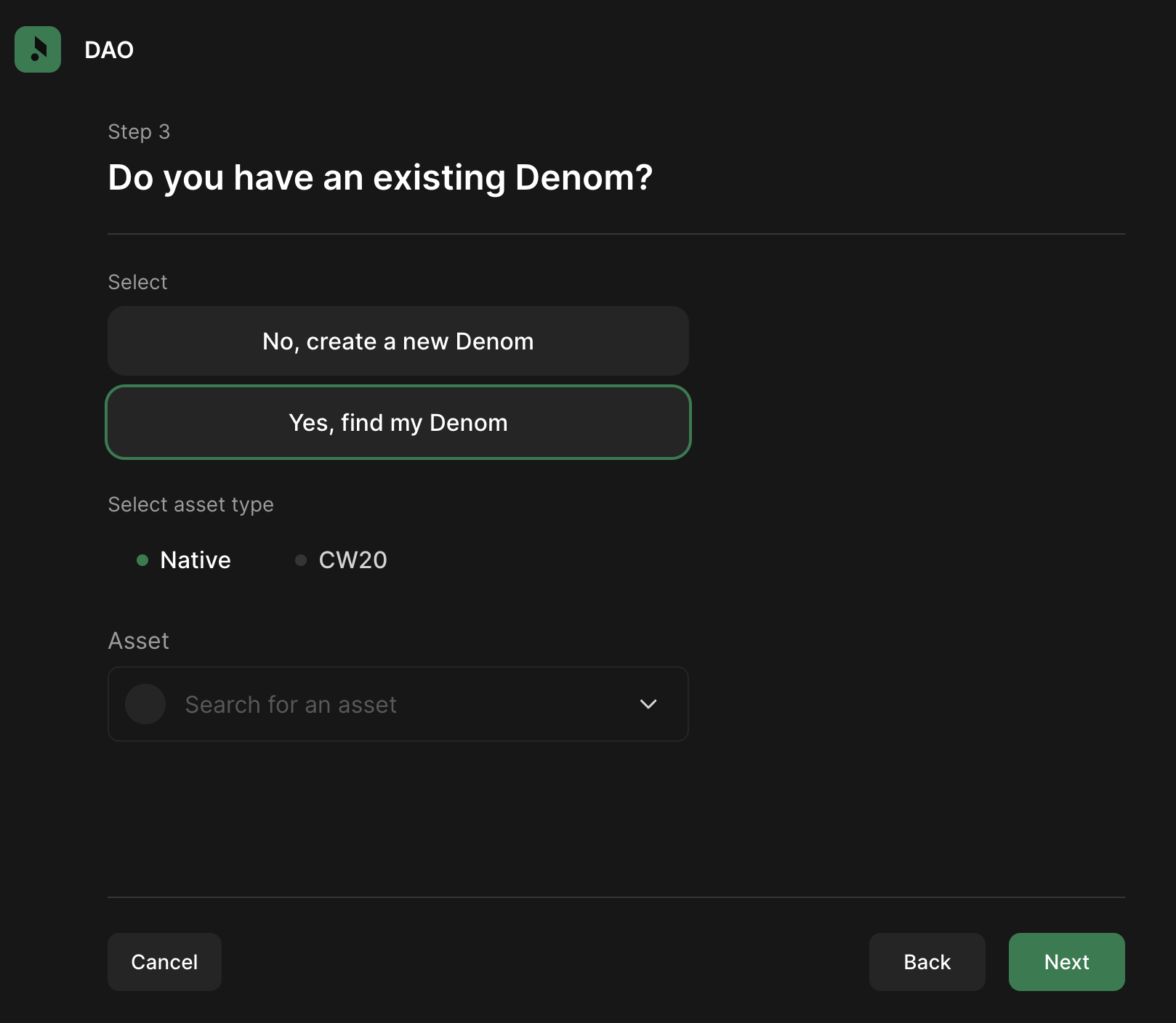 You can create a DAO using an existing IBC denom by entering the denom address during DAO creation.